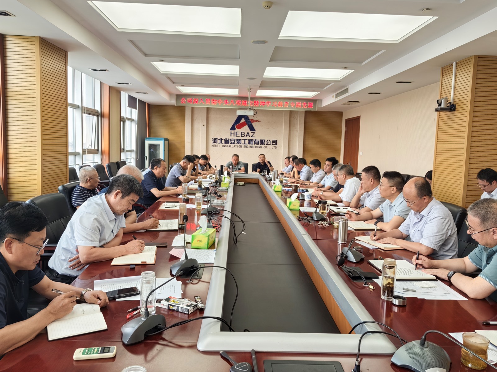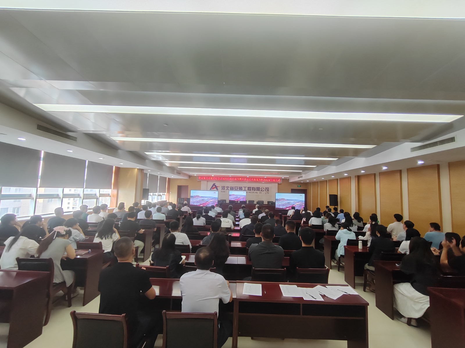 2025年9月3日,為紀(jì)念中國(guó)人民抗日戰(zhàn)爭(zhēng)暨世界反法西斯戰(zhàn)爭(zhēng)勝利80周年,河北省安裝工程有限公司積極組織職工集中觀看閱兵盛況直播。公司機(jī)關(guān)及各分公司、項(xiàng)目部共計(jì)2000余人通過多種方式同步參與,共同回顧歷史、緬懷先烈、展望未來。上午9時(shí),習(xí)近平總書記發(fā)表重要講話,9時(shí)19分大閱兵正式開始,公司機(jī)關(guān)及各分公司、項(xiàng)目部會(huì)議室座無虛席,職工們們整齊地坐在屏幕前,神情莊重地注視著電視畫面。在閱兵式過程中,